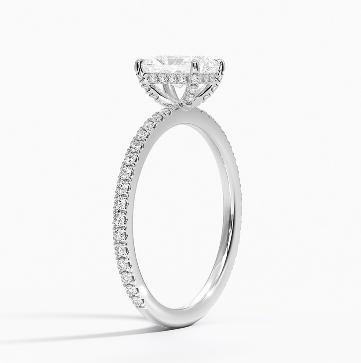 Premium luxury, excellent cut, natural radiant cut diamond. Set in 14kt white gold with round cut, natural diamonds accenting the setting, all the way down the band. Beautiful ring for a stunning person. Let the elegance shine!