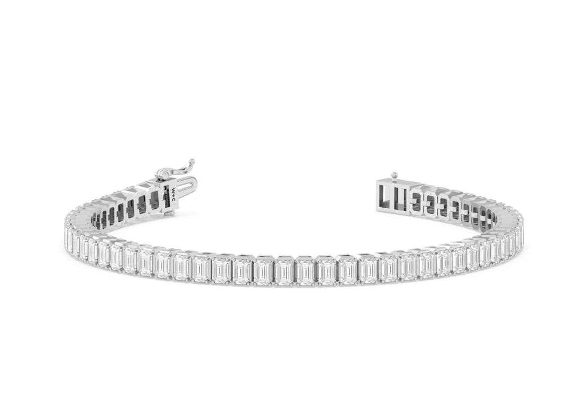 14k White Gold (9.03grm) 4-Prong Tennis Bracelet Style: - North- South Bracelet Size: - 7 inch Diamond Details: - Weight: - 14.70ct Shape: - Emerald Size: - 5 x 3mm Count: - 49pcs (No-Return Policy)